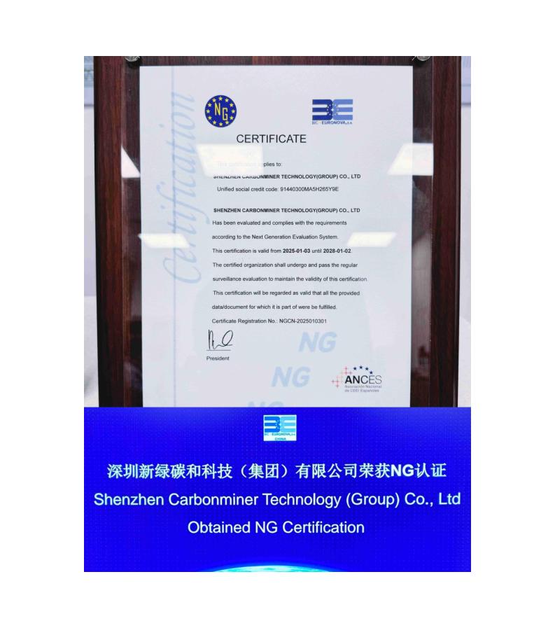 At the start of 2025, Shenzhen CarbonMiner (Group) Co., Ltd. reached a significant milestone. On January 4th, the company received the EU NG certification, becoming the first Chinese CCUS company in the carbon utilization sector to achieve this recognition. The certification ceremony took place at the Sino-European (Shenzhen) Carbon Neutrality Concept Validation Center, with Mr. Chen Yu, Founder and CEO of CarbonMiner, and Ms. Gan Lu, Executive Director of BIC EURONOVA (EU Innovation Center) Greater China, in attendance to witness this historic achievement.